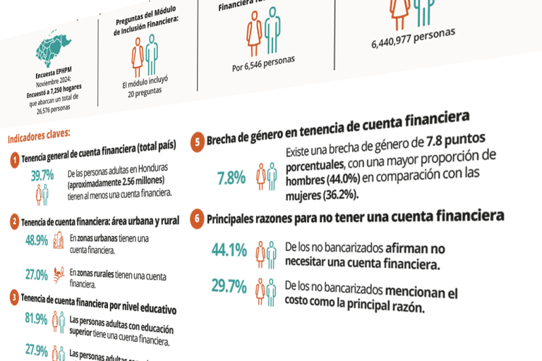 La Comisión Nacional de Bancos y Seguros (CNBS) y el Instituto Nacional de Estadística (INE), con el respaldo técnico y financiero del Banco Interamericano de Desarrollo (BID) y de ONU Mujeres (en el marco del programa MELYT II, financiado por el Ministerio de Asuntos Exteriores y de la Cooperación Internacional de Italia (MAECI), a través de la Agencia Italiana de Cooperación para el Desarrollo (AICS), y del programa Ecosistema Financiero Inclusivo (EFI), apoyado por la cooperación del Gran Ducado de Luxemburgo), presentan los resultados del Módulo de Inclusión Financiera, elaborado a partir de los datos recolectados en la Encuesta Permanente de Hogares de Propósitos Múltiples (EPHPM) 2024.